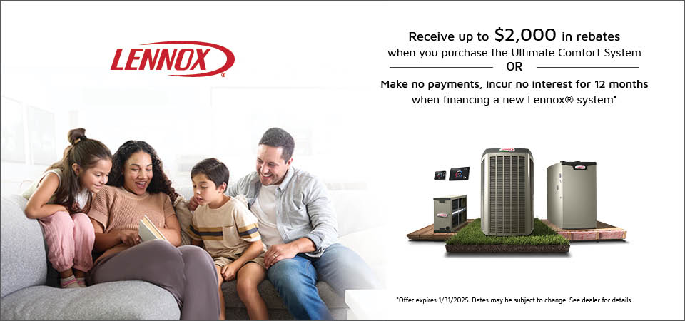 **Offer available January 6, 2025 and January 31, 2025. All applications are subject to credit review and approval. Not all applicants will qualify. Requires purchase of qualifying Lennox® system. No down payment required. If you qualify for this promotion (“Promotion”) and elect to participate, Finance Charges (interest) will not accrue for the first twelve months (Promotional Period), and you will not be required to make payments during the Promotional Period. If you pay the entire amount financed on or before the last day of the Promotional Period (Promotional Expiration Date), you will not have to pay any Finance Charges. However, if you qualify and elect to participate in the Promotion and do not pay the entire amount financed on or before the Promotion Expiration Date, you will be charged Finance Charges starting the first day after the Promotion Expiration Date at an annual percentage rate (APR) of 11.95%, and the balance will be payable in 120 scheduled monthly payments of $14.30 per $1,000 of the amount financed. No prepayment penalties. Minimum and maximum amount financed of $3,000 and $100,000, respectively. Late charges may apply. Complete terms and conditions and Truth in Lending disclosures will be set forth in the Retail Installment Contract which you should review carefully.